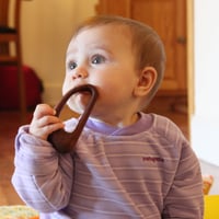 We originally designed this rattle for our good friends: a climbing couple who had recently had a child. We drew our inspiration from the form of a carabiner. Honestly it was almost too beautiful to give away, but Emma seems to enjoy it very much. Since then other parents and friends have asked about them, so we began to produce them in limited quantities. There is something compelling about the shape and feel of this object, and when you discover it makes sound.. its a magical thing!