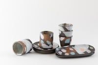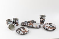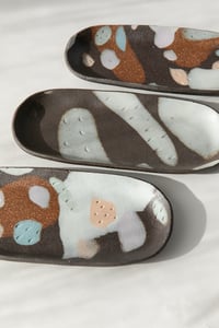 Porcelain and stoneware inlayed slabs. Handbuilt and formed. Each piece rolled with a variety of colors layered over each other.
